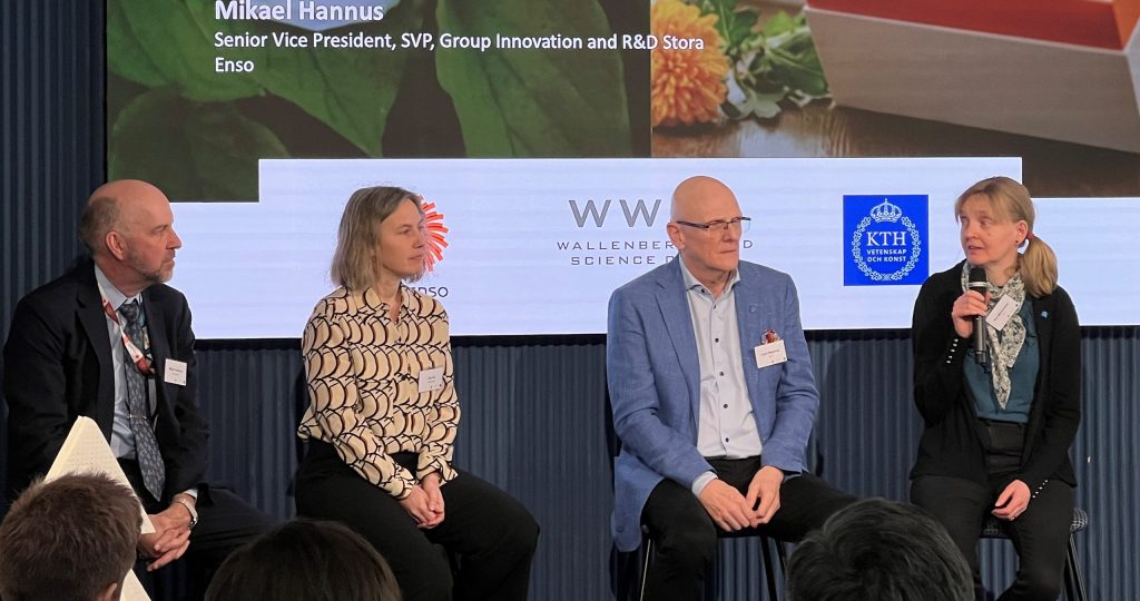 The panel, consisting of Mikael Hannus, Senior Vice President, SVP, Group Innovation and R&D Stora Enso, Åsa Ek, Acting Head of Innovation, Stora Enso Biomaterials, Lars Wågberg, Professor WWSC/KTH and Eva Malmström, Director WWSC, Professor KTH discussed the value of collaboration between industry and academia for future innovations and all was strikingly agreed on that while develop trust and understanding takes time, collaboration is valuable and give new perspectives for both sides. And as the tagline for the panel discussions said; innovations cannot happen in isolation.